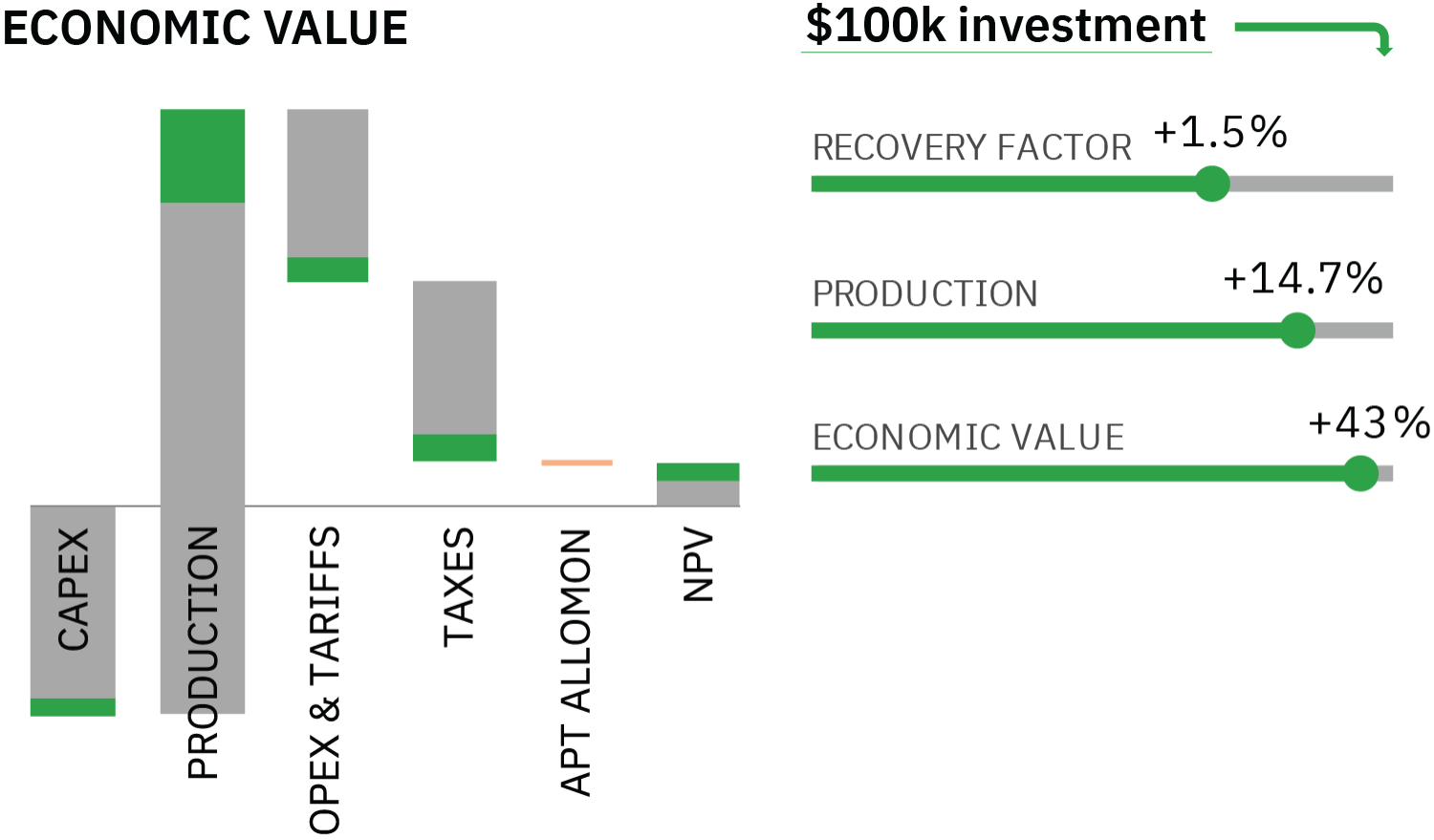 Figure – Waterfall diagram of estimated cost (CAPEX, OPEX, etc) designations for a 3 pad development in the Permian Basin, TX, including investment in APT Allomon. Potential improvements in recovery factor, production and economic value are shown relative to a $100K investment.
