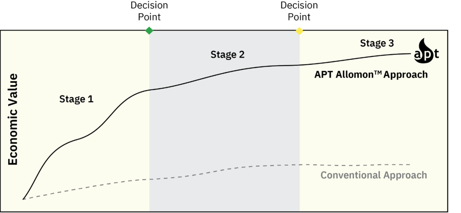 Through an effective decision modelling framework, APT and DecisionNodes performed pre-post analysis to evaluate the difference in observations on existing well pads, the performance of new well pads and the expected economic life-time value of the program. In the case-study there is a 60% probability that a $100k investment in APT Allomon™ will improve the economic value of the project by 43%.